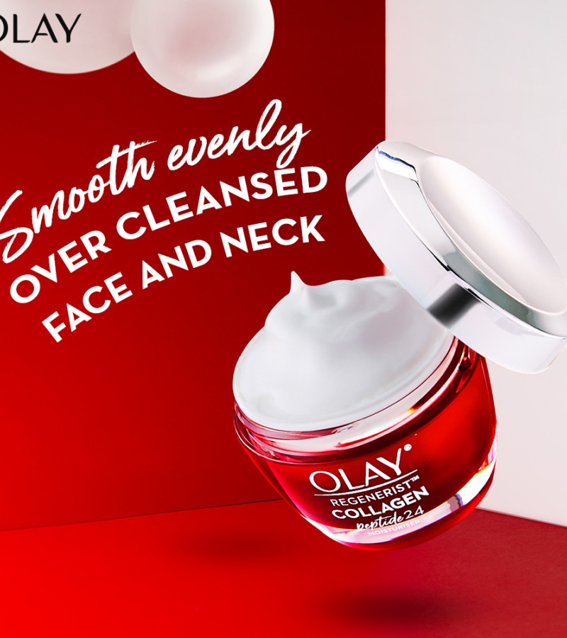 Plump & Bouncy Skin all day long. Olay’s Unique technology Collagen Peptide 24 penetrates^ better into the skin. Regular collagen have larger molecules that couldn’t penetrate into the skin. Olay’s Collagen Peptide is a smaller molecule, hence it penetrates^ better into the skin.