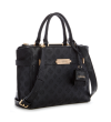 - This versatile satchel is structured with a divided interior with belted logo emblem at front and detachable crossbody strap.